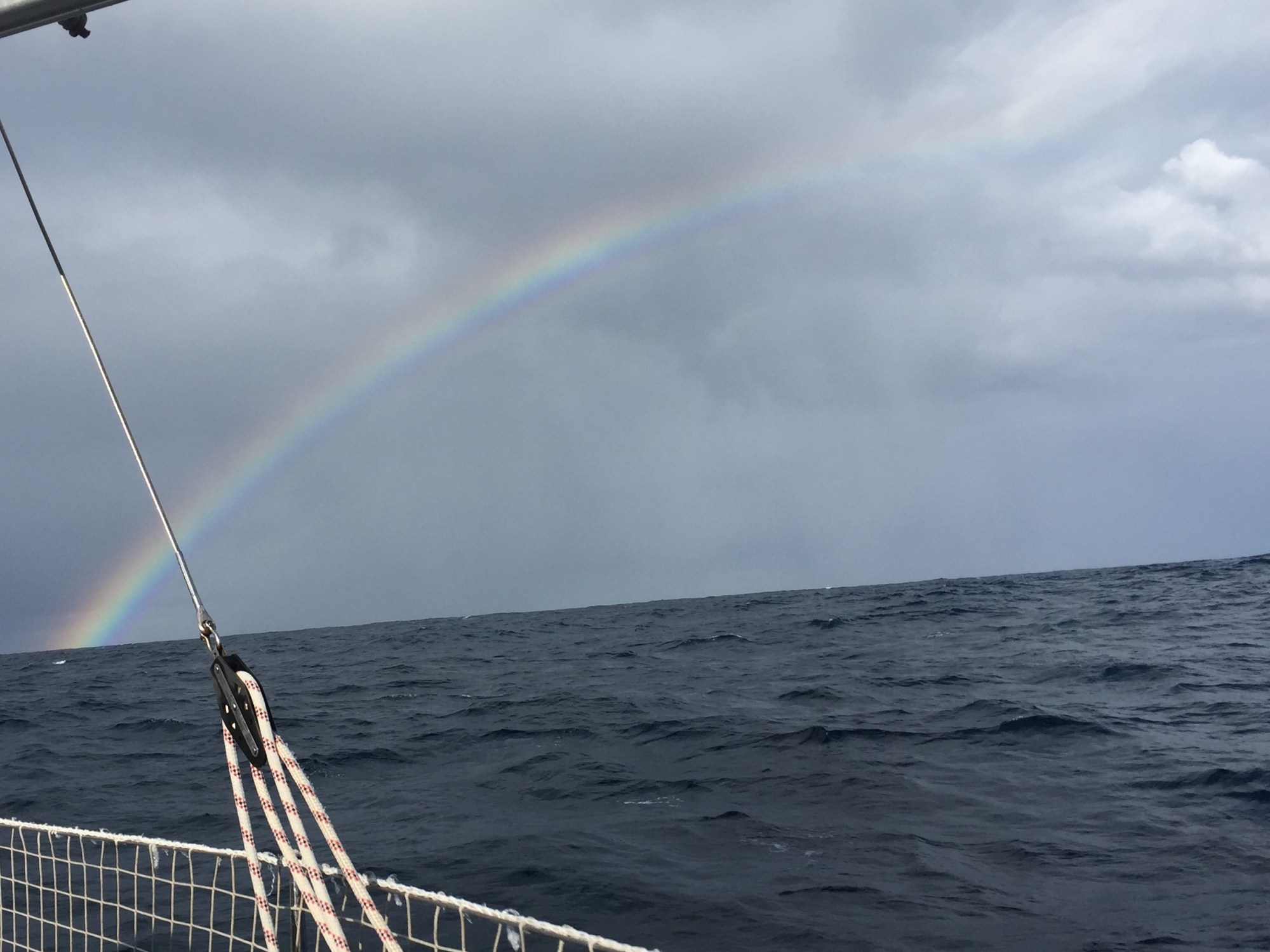 Le système météo était clair, et même si les prévisions Grib sont toujours en dessous de la réalité, pas de surprise de ce côté là. On alterne portant et travers, normalement des allures plus confortable que le près, mais la mer, sans être forte, est très désordonnée et pas agréable du tout. Les 5 premiers jours ne sont pas les meilleurs : Ambiance nauséeuse que le ciel gris et le froid n’aident pas à alléger : les repas et les quarts ne passent pas toujours bien.